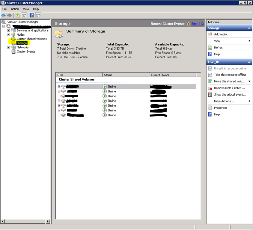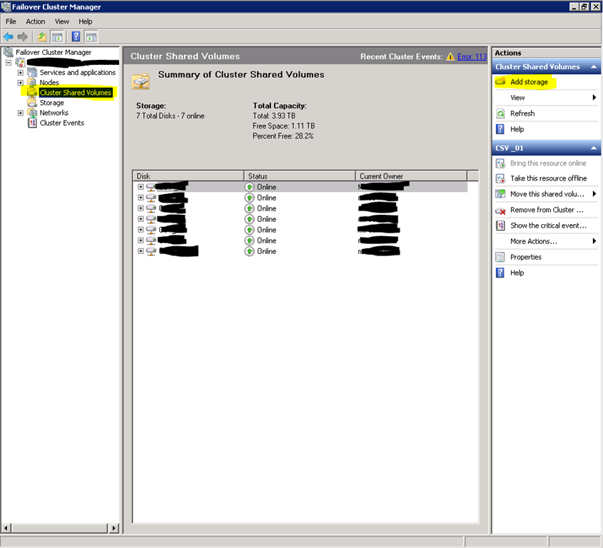 Step 9: Now it is time to make it a “CSV”, Click “Cluster Shared Volumes” and click “Add Storage”