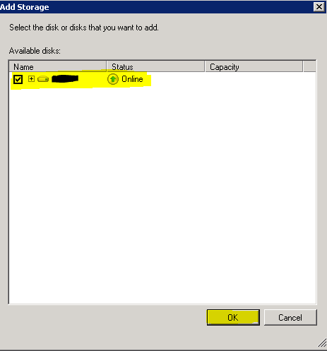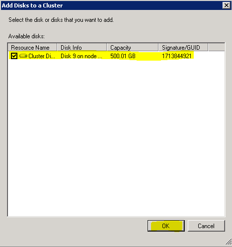 Step 8: Add the Disk, you should see the newly presented disk, select the disk and click OK. The disk will show up as online under “Available Storage”. You can rename the disk according by double clicking the disk and changing the name in “Resource Name”