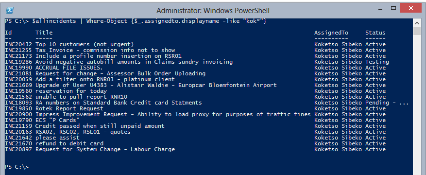 -like operator. The example is finding all calls assigned to a user where the name is like “Kok*”. This time without the “out-gridview”