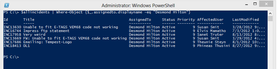 $allincidents | Where-Object {$_.assignedto.displayname -eq "Desmond Hilton"}