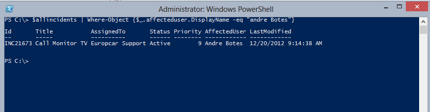 $allincidents | Where-Object {$_.affecteduser.DisplayName -eq "andre Botes"}