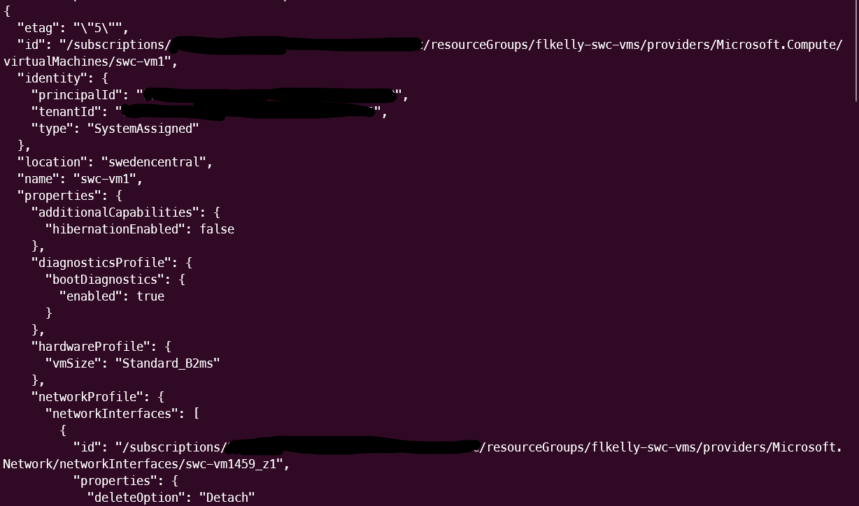 We need to provide some variable(s) or information as marked by items in braces (“{}”), so we need to provide “subscriptionId” and “resourceGroupName”. I will endavour to provide as much information as possible, however for safety reason, some items will be obfisicated.